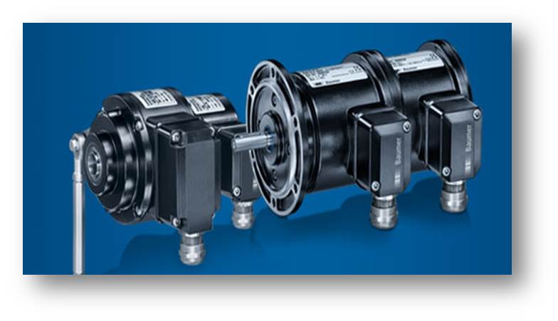 Combinaciones de codificadores, tacogeneradores, e interruptores de velocidad: Muchas aplicaciones de accionamiento no sólo requieren control de velocidad, sino también la integración de las otras señales en el control. En estrecha colaboración con los usuarios de diferentes industrias, Baumer ha sido el principal fabricante mundial de combinaciones de servicio pesado integral (tacogeneradores e interruptores de velocidad en una sola unidad robusta).